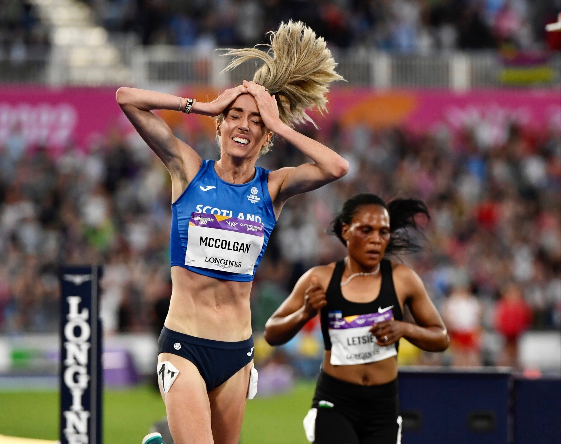 The sold-out crowd of 32,000 at Birmingham’s Alexander Stadium roared as McColgan sprinted to her first gold medal at an international competition. She ran straight to the arms of her mother, Liz, where the two shed tears of joy and triumph, while wrapped in the Scottish flag.