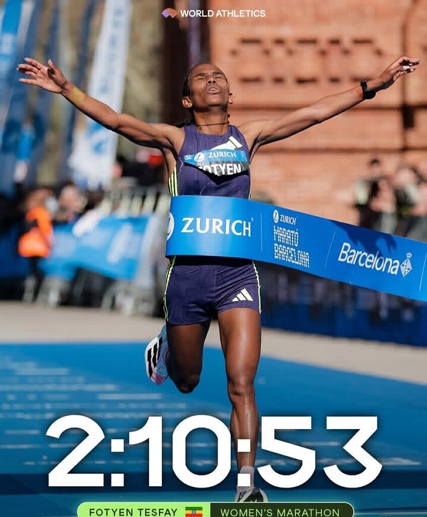 Distance running witnessed a remarkable moment at the Barcelona Marathon 2026, where Ethiopian star Fotyen Tesfay delivered one of the most extraordinary marathon debuts ever recorded. In her first attempt at the classic 42.195-kilometer distance, Tesfay stormed through the streets of Barcelona in 2:10:53, producing the second-fastest women’s marathon time in history.