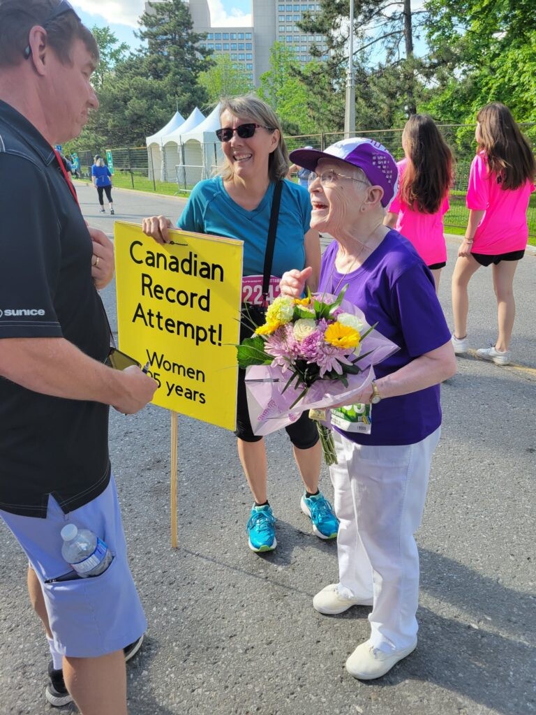 Although Fairhead set a new Canadian record for her age group, she was second in her 80+ age category. She was beaten by 80-year-old Marie Mullally of Ottawa, who clocked a speedy 5K of 48:01. Mullally’s time is 20 minutes back of the 80+ 5K record set by Alice Cole of Montreal in 2015 (28:38).