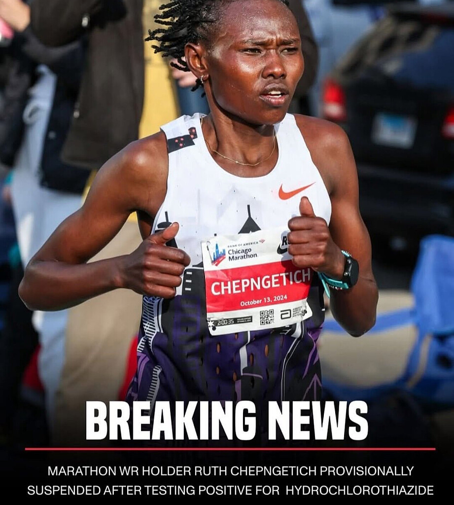 Marathon world record holder Ruth Chepngetich has been provisionally suspended by the Athletics Integrity Unit (AIU) after testing positive for hydrochlorothiazide, a banned diuretic often used as a masking agent.