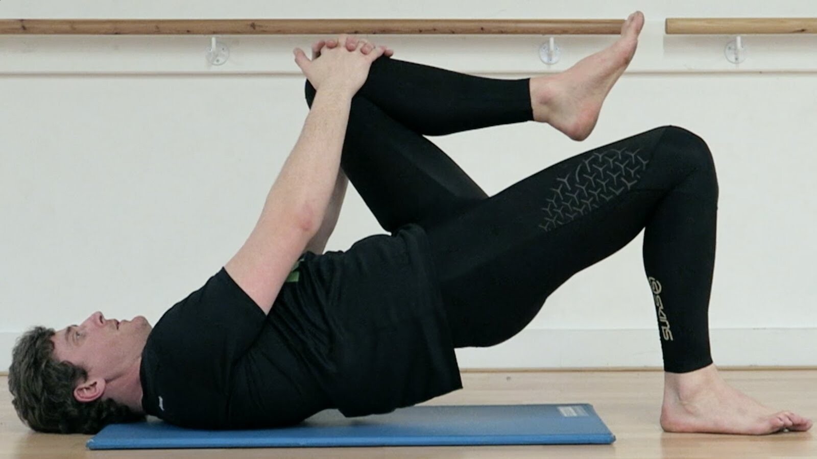Press through your left heel to lift your hips toward the ceiling.