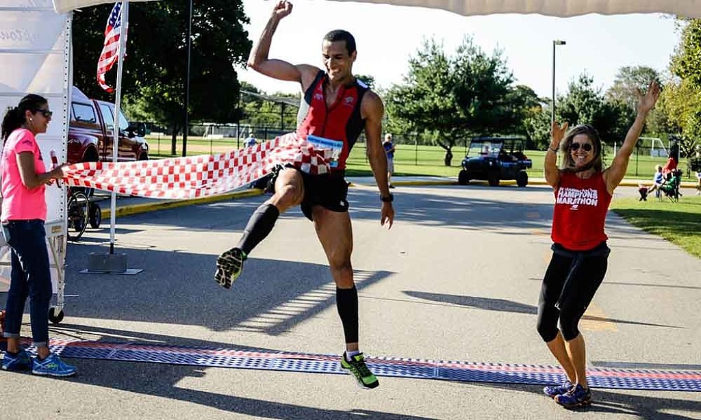 Matthew Futterman, the deputy sports editor at The Times, crossing the finish line at the Hamptons Marathon