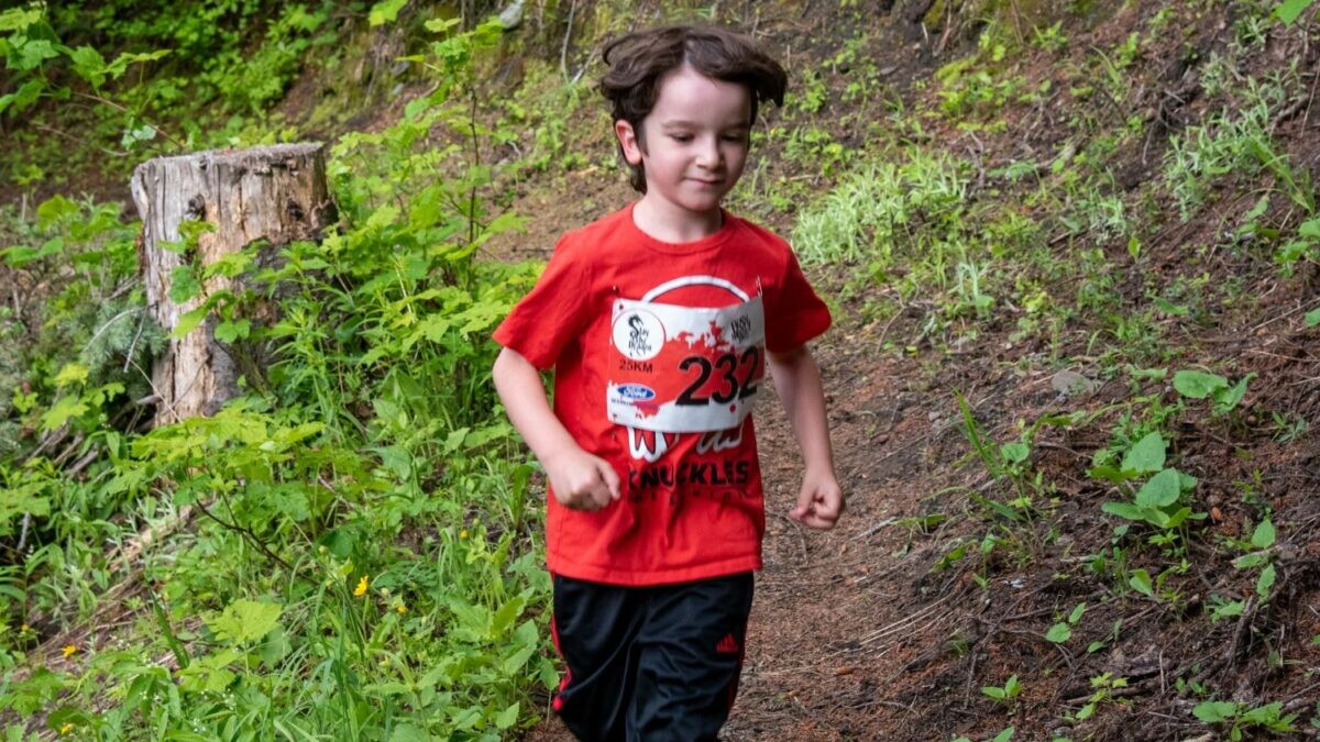 Heading into the 25K, Jake said Emmett was nervous, but they prepared for the race by hiking five kilometres the day before. Starting from the back of the pack, the duo maintained their pace throughout the race, embracing the occasional fall (no injuries reported) and aid stations filled with treats for Emmett. They completed the 25K trail race in six hours and 23 minutes, finishing last of all 84 participants.