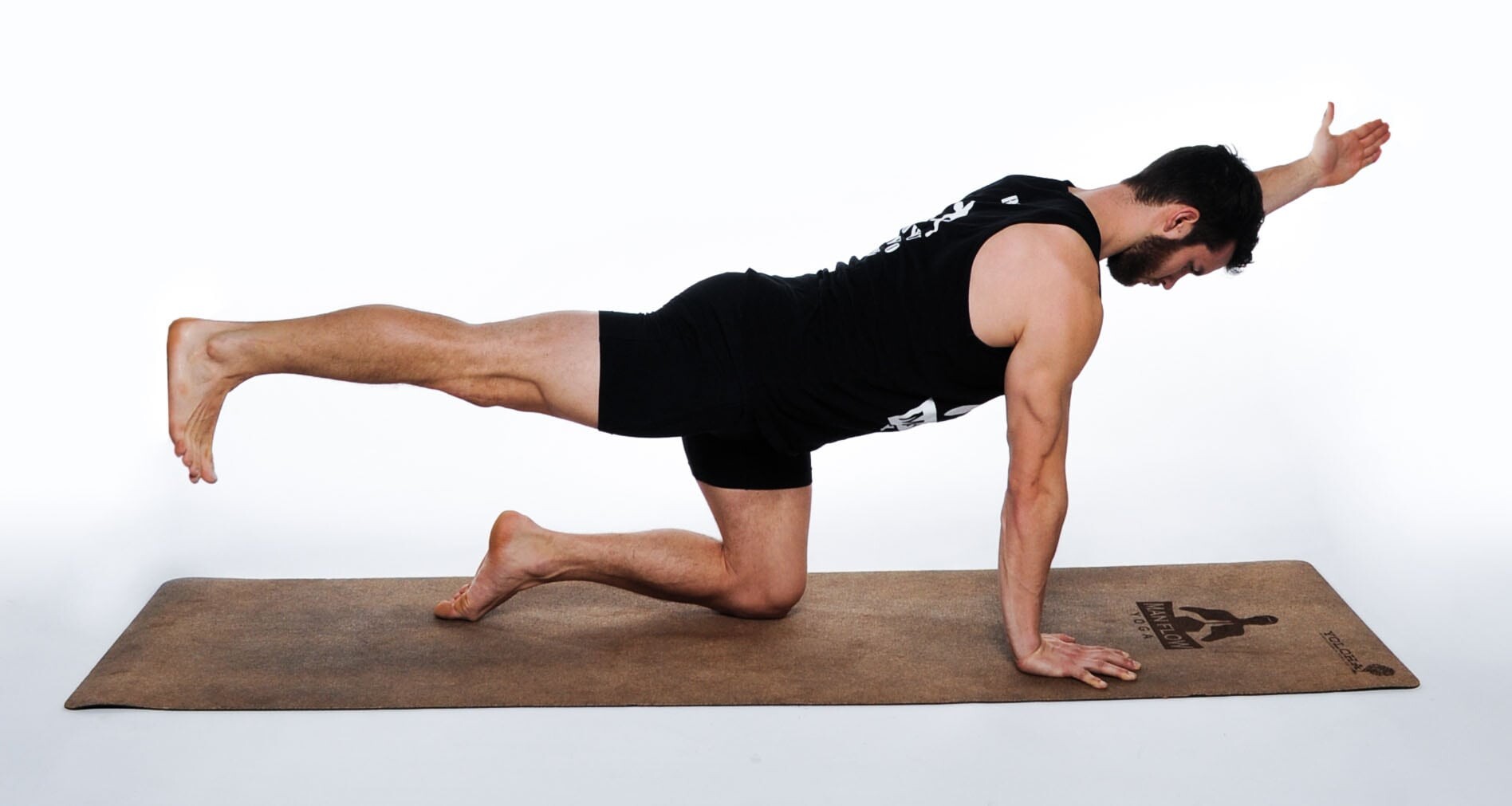 Engage your core and extend your right arm forward while simultaneously extending your left leg straight back.