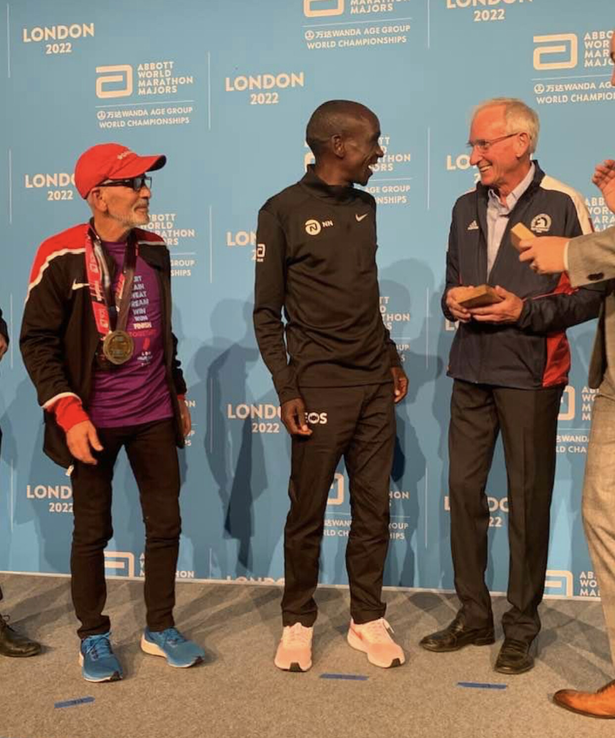 third photo: Gene Dykes on podium after winning the 70-74 age group with Eluid Kipchoge, the Goat!