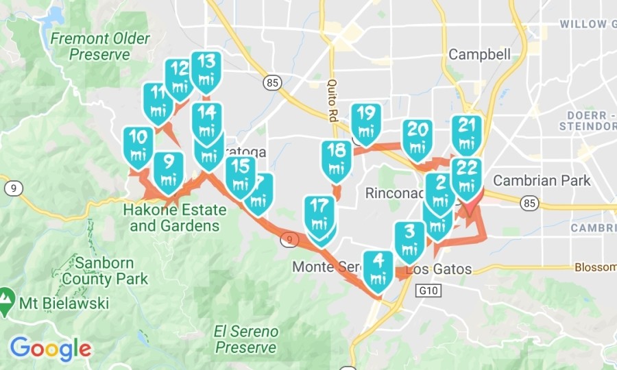 Fun run.. mostly before the valley awoke and streets got busy. (Sat 27)9.79 miles in Los Altos and Mt View (runner profile)