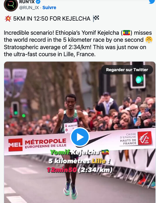 On the 5 km international of Lille, the Ethiopian Yomif Kejelcha came to fail at a second of the world record of the specialty (12'49'' by Berihu Aregawi) by completing his effort in 12'50'' (2nd world performance history) ahead of Kenyan Reynold Kipkorir (13'04'') and Ethiopian Telahun Bekele (13'07''). Already the world record holder for the Indoor Mile (3'47''01), the double world champion in the 3,000m indoors almost added a line to his list.