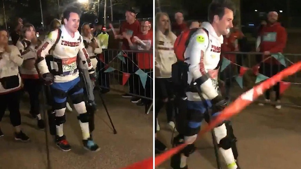 Simon Kindleysides set off at 10am on Sunday alongside thousands of other racers and finished at 10:46pm on Monday - the last person to cross the line. The 34-year-old, a father of three was diagnosed with functional neurological disorder and a brain tumor in 2013, which left him paralyzed from the waist down. He walked the 26.2-mile marathon course using a ReWalk exoskeleton suit. He has been awarded the Spirit of London award, which the London Marathon gives to participants who "encapsulated the unique spirit" of the race. He is the first finisher from this year's race to be given the award. Simon was raising money for The Brain Tumor Charity and at the time of writing has raised £8,630.04 ($12,032US) just short of his goal of £10,000.