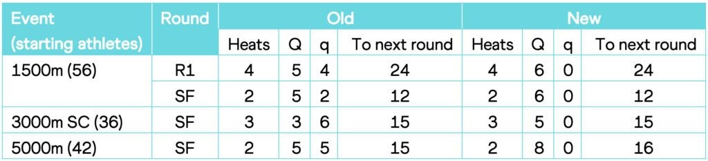 In the new system, each heat of the men’s 1,500m will allocate six qualifying spots to the next round, while the 3,000m steeplechase heats will hold five spots and the 5,000m heats eight spots. There will still be fastest-time qualifiers in sprint events (100m-400m) and the 800m.