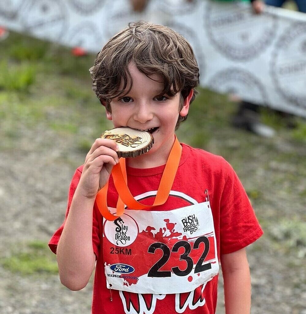 Once the two returned to the village after covering 25 kilometres with 561 metres of elevation gain, Emmett was keen to receive his medal and show it off to everyone. When Emmett was asked what he had learned from the race, he said, “It was pretty fun.”
