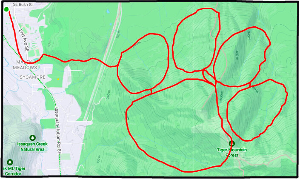 The Tiger Claw is sort of a multiple-loop race, in that you run multiple loops, and pass through the same checkpoint (the lower aid station) at the end of each loop—but that checkpoint is still three miles from where you parked your car at the start/finish, so maybe it’s less tempting. (you could call someone and ask them to pick you up at the aid station, though, since it’s about 150 feet from a parking lot that’s only a mile from I-90)