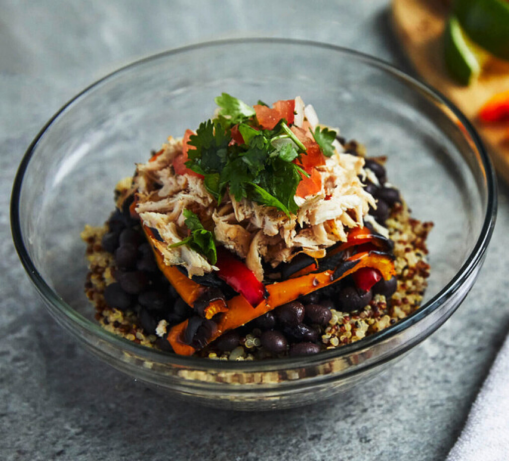 Lunch: A quinoa, farrow, or brown rice bowl with sweet potatoes, vegetables, and a lean protein, like chicken or canned tuna