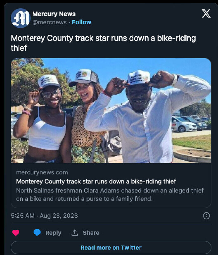 On Wednesday, Clara Adams, a 14-year-old track star from Salinas, California, ran after a purse thief riding a BMX bike.