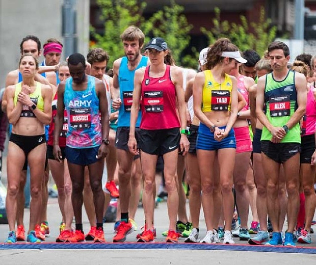 Gwen Jorgensen continued her road to the marathon with a disappointing, for her, 4th place in the USA Track & Field Half Marathon Championships in Pittsburg, PA. on Sunday May 6. She finished in 1:10:58, behind Aliphine Tuliamuk's 1:10:04 for the win. It was Gwen’s first half-marathon and she felt the pain of a torrid early pace. Notwithstanding her sense that it wasn’t her day, it’s the third impressive performance for the new pure runner in as many races, with a 15:15 indoor 5000, a 31:55 outdoor 10,000 (for the win) and now this. Gwen has a way of lasering in on the weakness in her game, as she did while shoring up her swim and bike in triathlon, and one expects her just to get better. Whether her best event is the marathon or something shorter is still an open question, but that’s a good problem to have. (Photo: Gwen in red singlet with hat)