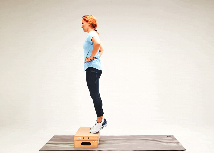 Then, lift left foot off step and stand on just right foot. Slowly lower right heel past the edge of the step for a count of five.