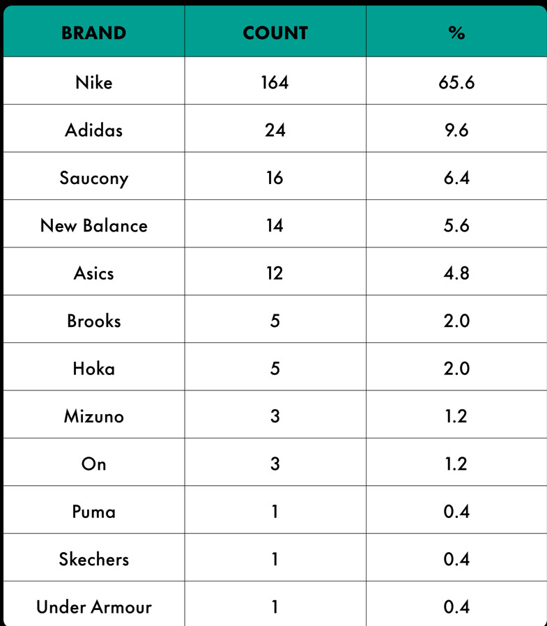 The takeaway from all this? There are many brands building great racing shoes right now, as evidenced by the parity in the top finishers of marathons. But, further back in the pack, Nike still dominates with competitive runners. That stands to reason, as they had a few years head start on everybody else in the super shoe race.