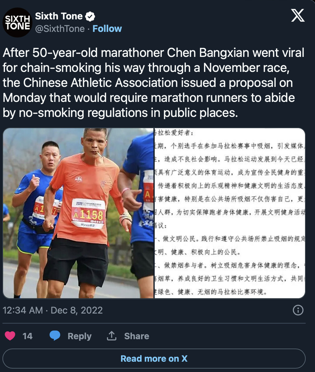Within seconds, I saw a post of a man lighting a cigarette in the middle of the Xin’anjiang Marathon, gathering hundreds of comments and shares. At the time I thought it was funny, but I had no idea what would come of it. I had the same reaction as you (probably) when you first read the story. The concept of a runner smoking cigarettes during a marathon and running well is hilarious and incredible. I had to investigate.
