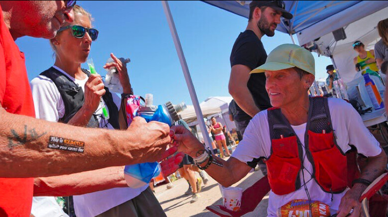 It was exactly here, at this midway point, after slogging up the final climb over rolling hardened granite and sandy washes, where Tracy had a sticking point. Fortunately, Courtney was there to fill up her water bottles and point out all the tasty options when they reached the runner’s buffet.
