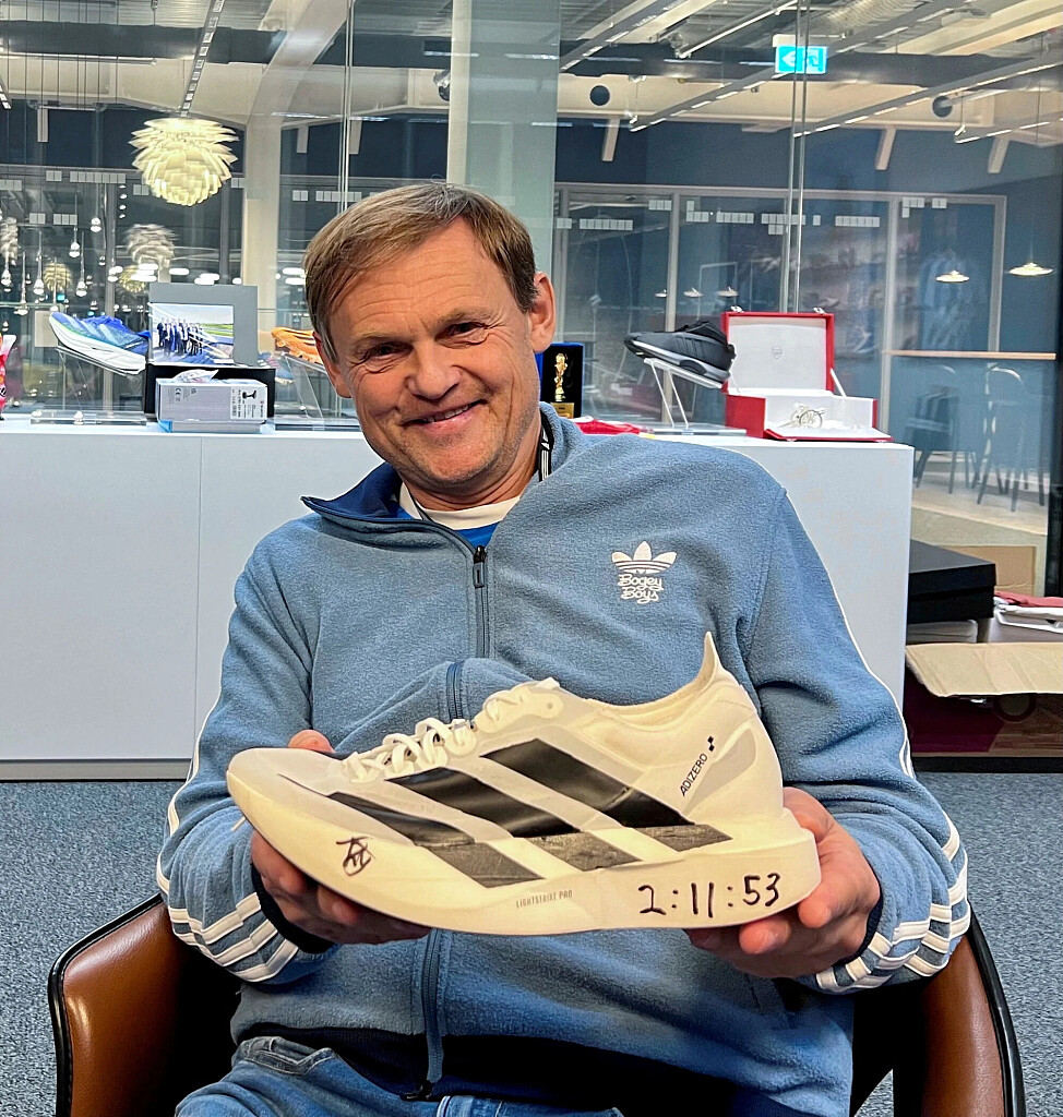 (First photo) Adidas CEO Bjorn Gulden, holds a shoe worn by Ethiopia’s Tigist Assefa when she set a new women’s world record at the Berlin Marathon.