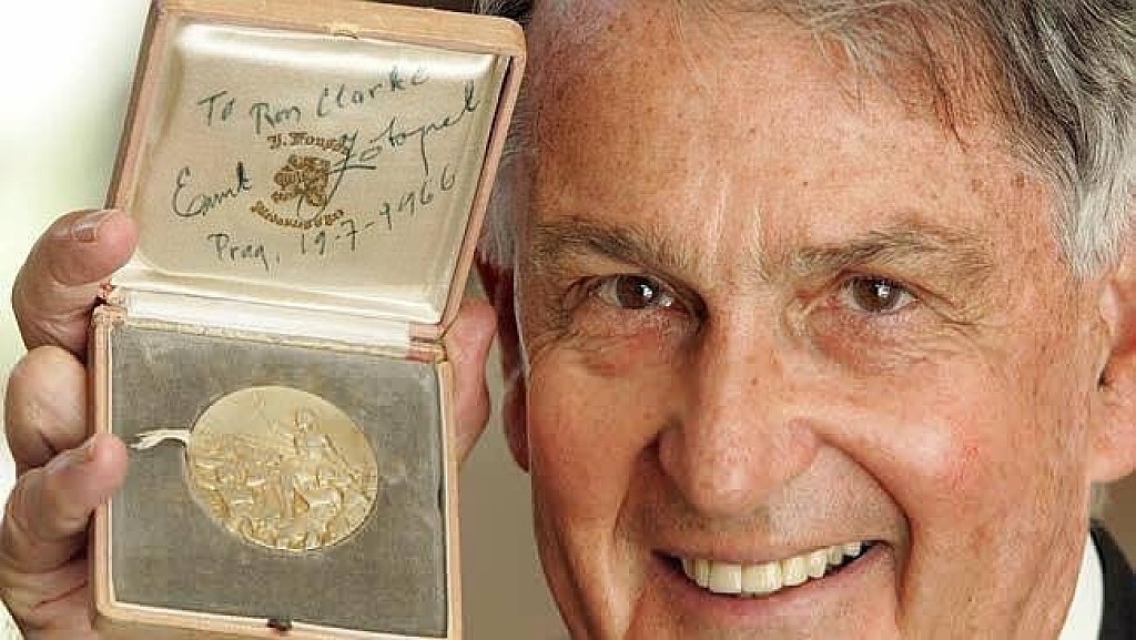 (Photo - Ron Clarke with the gold medal Emil gifted to him.)