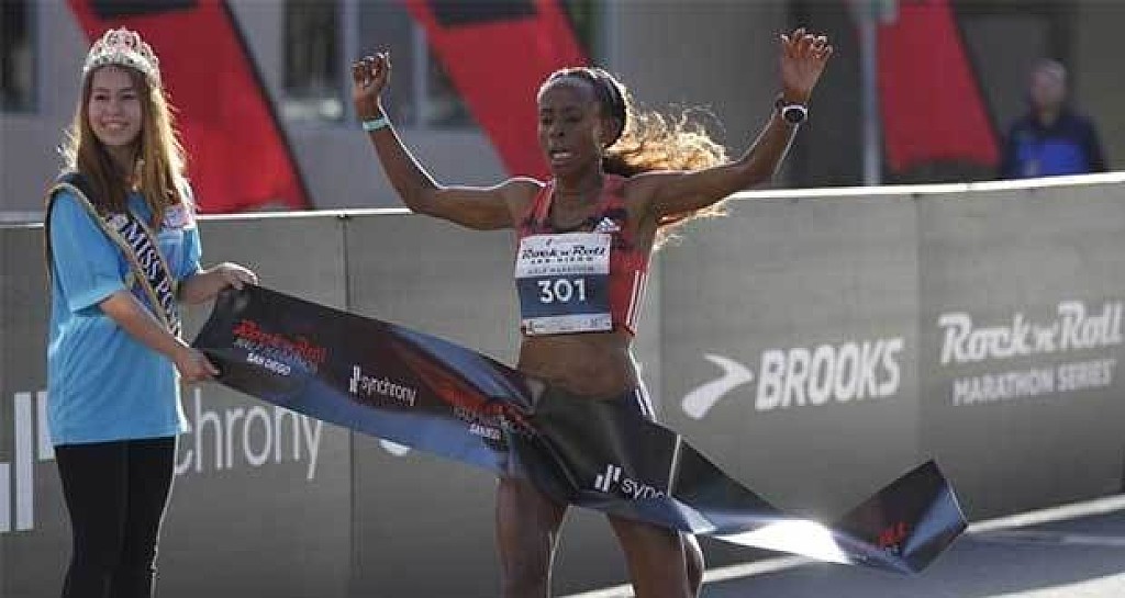 Two-time Olympic gold medalist Meseret Defar of Ethiopia won the women's Synchrony Rock 'n' Roll San Diego Half Marathon on Sunday while Titus Ekiru of Kenya upset Olympic silver medalist Feyisa Lilesa of Ethiopia in the men's race. The elite runners in the half and full marathon had finished long before the race was halted for about 10 minutes and rerouted after a police officer accidentally shot himself in the leg while pursuing a hit-and-run suspect who pointed a weapon at police and was eventually arrested on the roof of a parking structure near the finish line in downtown. Defar, a two-time Olympic champion in the 5,000 meters, finished in 1 hour, 8 minutes, 26 seconds, well ahead of Jane Kibii of Kenya, who clocked 1:12:00. Kaitlyn James of Cuyahoga Falls, Ohio, was third in 1:13:54. Ekiru won the men's race in 1:01:02, 16 seconds ahead of Lilesa, who won the silver medal in the marathon at the Rio Olympics. Josphat Kipchirchir of Kenya was third in 1:02:21.