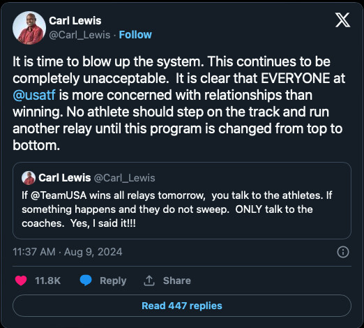 Lewis posted on X ahead of the race suggesting the coaches should be held responsible if the U.S. failed to medal.