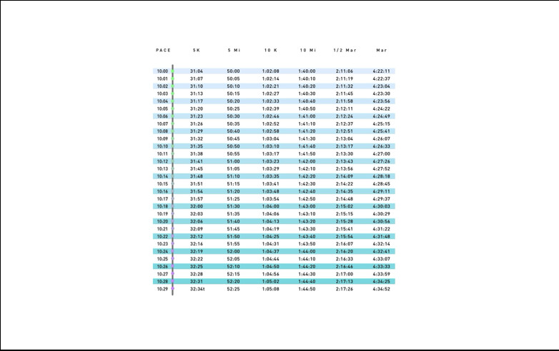 Use our charts as a reference point after you start training so you can know what average pace is necessary (and realistic) for your upcoming goal race.