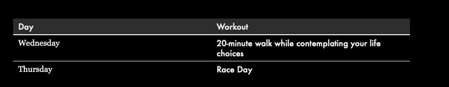 If you just noticed that Thanksgiving is tomorrow and you’re racing in 12 hours, it’s…fine. Maybe it’s a day to drink more water and less Diet Coke. Move your body a little. Find (or buy) some running shoes.