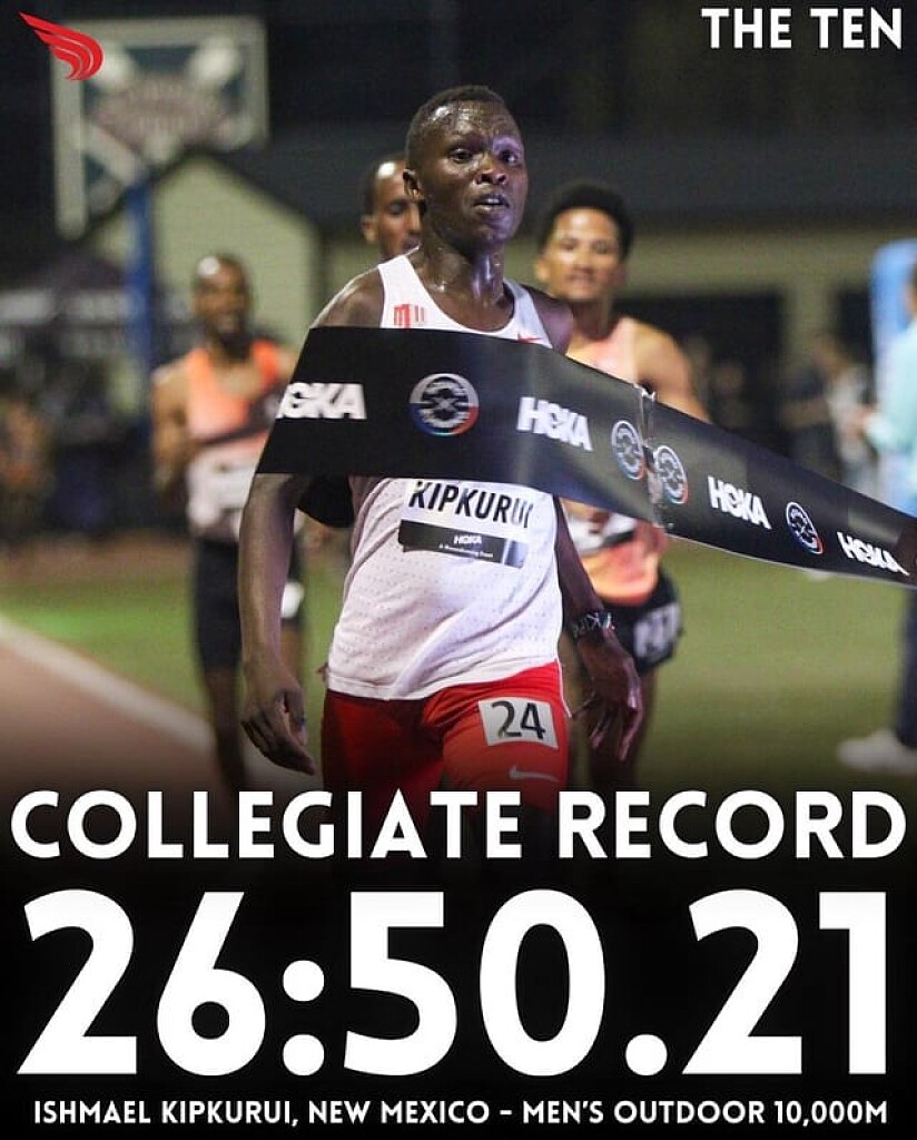 In a remarkable performance at The TEN 2025 meet on March 29 in San Juan Capistrano, California, University of New Mexico freshman Ishmael Kipkurui set a new NCAA 10,000-meter record with a time of 26:50.21 which is 4:19 per mile pace. This achievement surpasses the previous record of 26:52.72, set by Northern Arizona’s Nico Young at the same event in 2024.