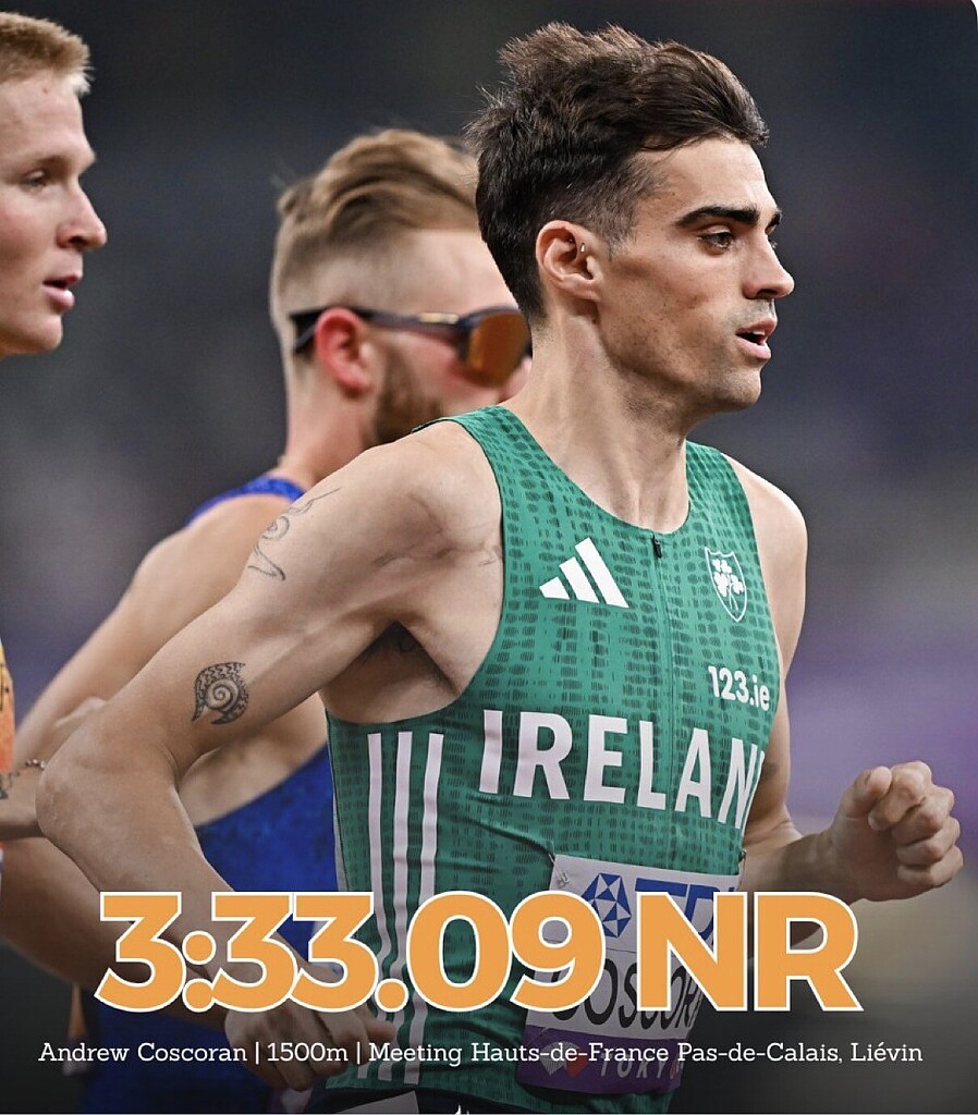 Competing at the prestigious Meeting Hauts-de-France Pas-de-Calais, Coscoran delivered a controlled and aggressive performance against a world-class field, reaffirming his place among Europe’s premier 1500m contenders.