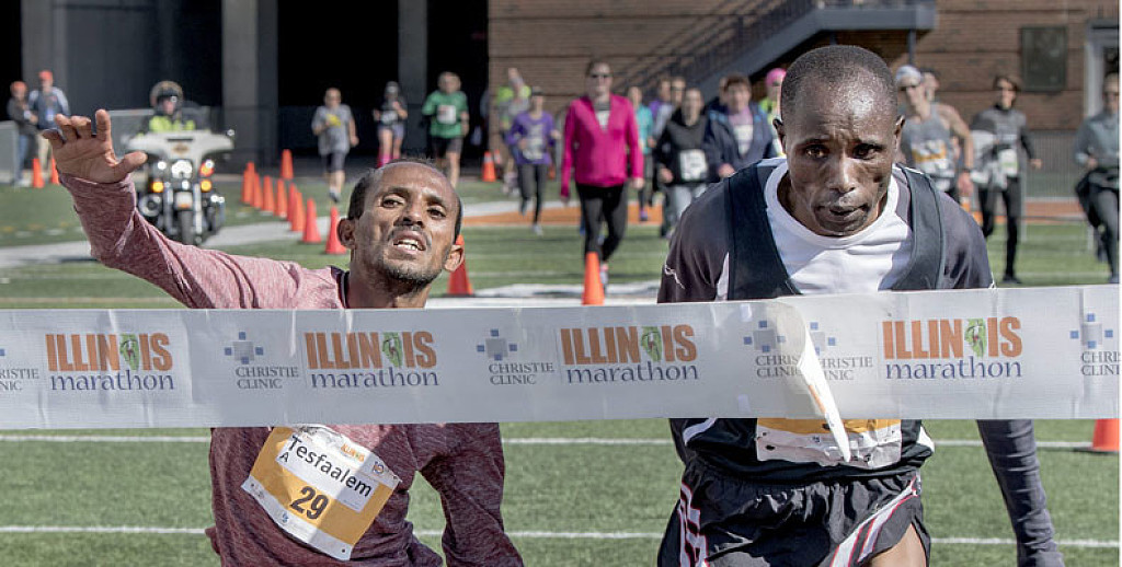 The top two finishers at last year's Illinois Marathon were both clocked at 2:21:03. The finish line judges gave the win to 22-year-old Tesfaalem Mehari and 39-year-old Wilson Chemweno second.