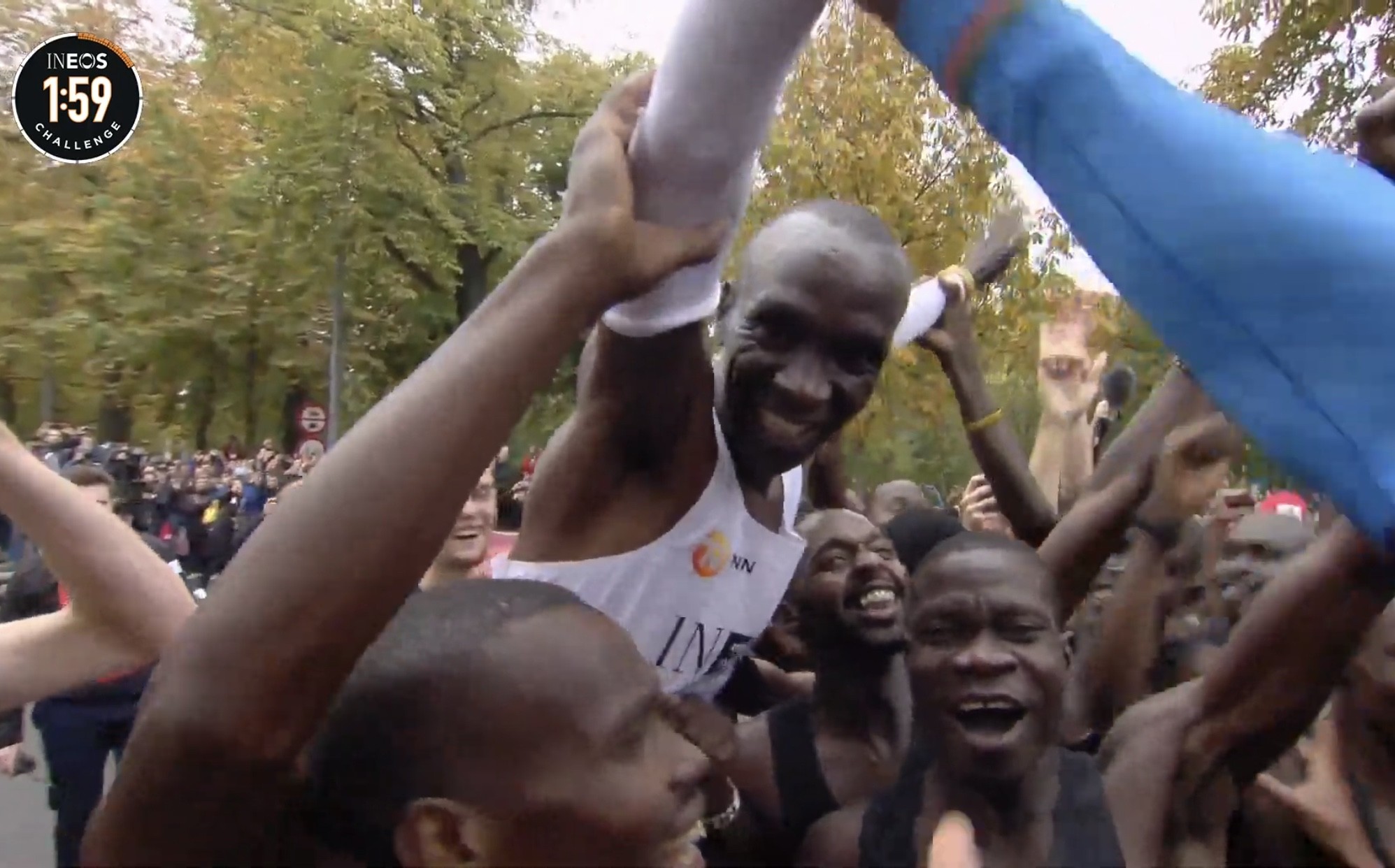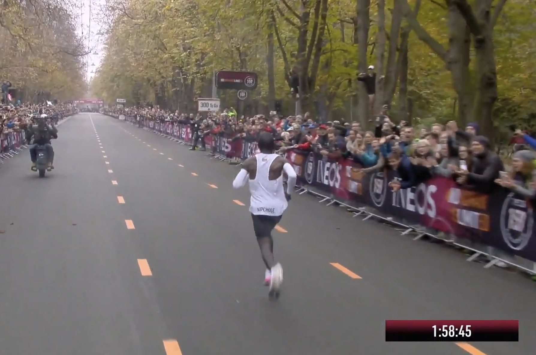 Eliud was under an hour at the half way point and finished very strong in 1:59:40. The pacemakers helped Eliud run 2:50 kilometers on the dot from 33k to 40k.
