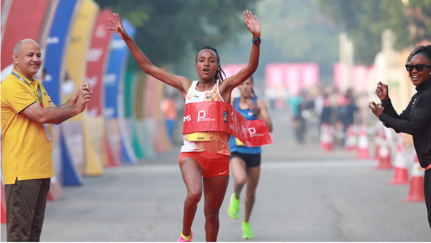 Coming into the final kilometre, Yehualaw – who won the African Games half marathon title in August – edged in front and briefly looked like she was going to cause an upset. But with the finish line approaching, Gemechu dug deep and managed to claw her way past her rival to notch up a personal best while becoming just the second woman to retain a title in Delhi.
