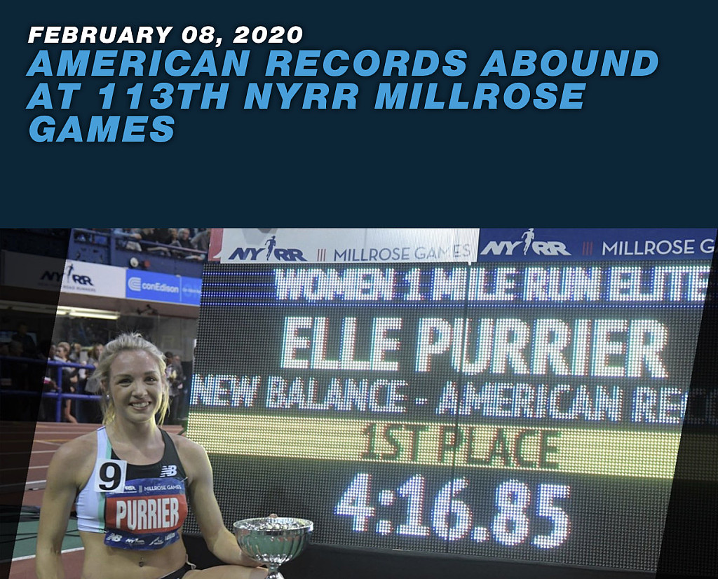 Elle Purrier raised the bar in the NYRR women’s Wannamaker mile smashing the American Record in 4:16.85. At the bell, Purrier powered ahead to outpace Germany’s Konstanze Klosterhalfen at the wire and break one of the oldest American records in the books, a 4:20.5 by Mary Slaney in 1982. Her en route time at 1,500m was 4:00.23, the second-fastest time in U.S. indoor history