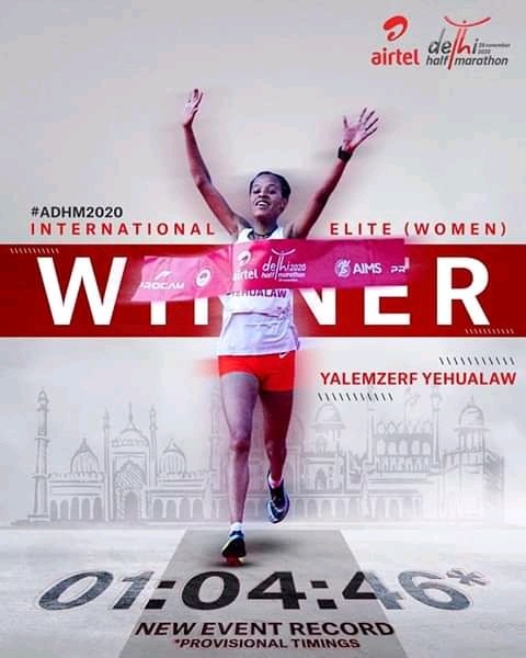 Ethiopian Amedework Walelegn dethroned his campatriot 2018 and 2019 winner Andamlak Belihu in a nail-bitting finish to win the Airtel Delhi Half Marathon men's race in a course record time of 58:53. Andamlak who was second settled for silver medal with a time of 58:54 while Stephen Kisa of Uganda Pocket bronze in 58:56.