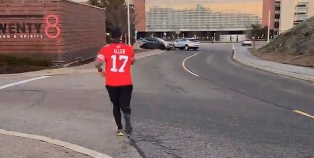 A little over a week later, Dee kept his word and lined up, untrained, around 4:30 p.m. on December 28 in his Josh Allen jersey for a marathon run through the empty parking lots and uncrowded sidewalks around Gillette Stadium. The start time was before the game because Dee had to beat the Massachusetts COVID curfew of 10 p.m. ET.