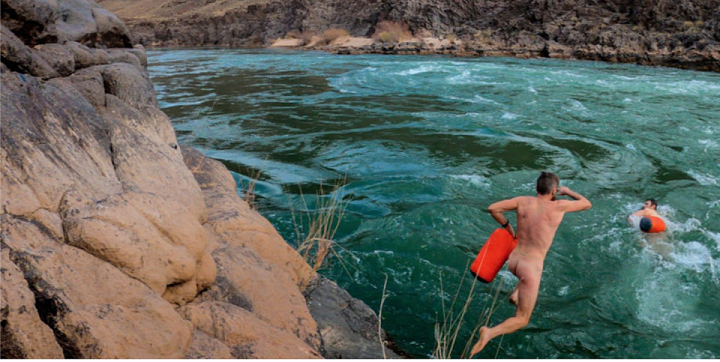And that’s exactly what the duo did. When they arrived at the river’s edge, they stripped down quickly, and packed up their dry bags. Foote had brought along a pack raft, but instead, they fought that fear we all have of jumping into cold water, and leapt into the river buck naked.