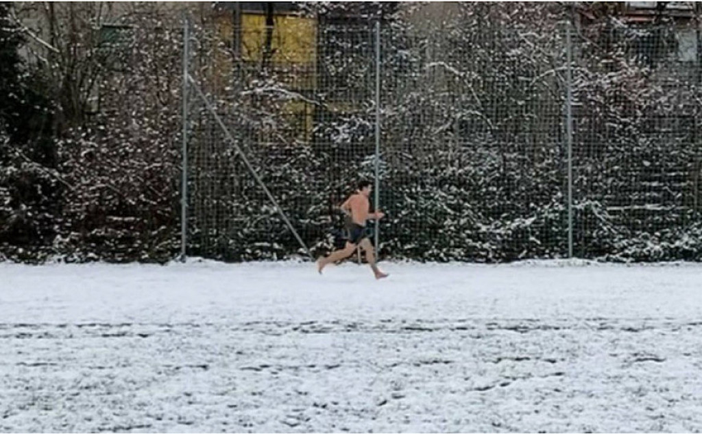 Weigand is originally from Germany, and formerly ran for the German National Track Team. While he no longer runs competitively, running is clearly still a big part of his life, and his background in competitive running gave him the leg-up on the record. He created a video to document his attempt, in which he claimed that he was in shape to run about 1:10 for the half if it were on an actual course, but was expecting to be much slower in the snow without shoes. To train for his attempt, Weigand ran all winter with no shirt to help him get used to the cold (usually keeping his shoes on), and once they finally had some snow in Switzerland, it was go-time.