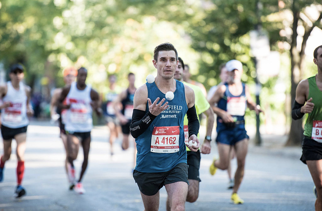 Kapral says he didn’t know Swartvagher before the event, but when Swartvagher — an experienced juggler and performer who is new to running — reached out with the invitation, Kapral didn’t hesitate to accept. “Johan had heard about me, and he wanted me to be his guest to show him the whole joggling thing,” Kapral says. “He doesn’t have much experience with running, but he’s done a great job.”