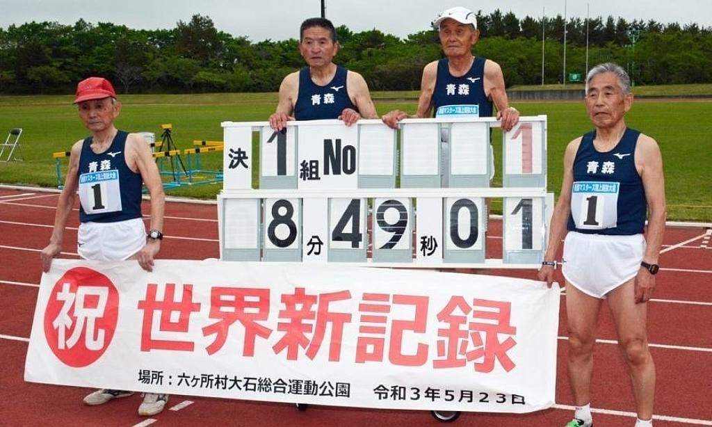 At Sunday's Aomori Masters Time Trials meet a Japanese men's team set a 4x400 m relay world record of 8:49.01 in the men's 90+ age category, taking nearly four minutes off the previous world record of 12:41.69 set in the United States in 2014.