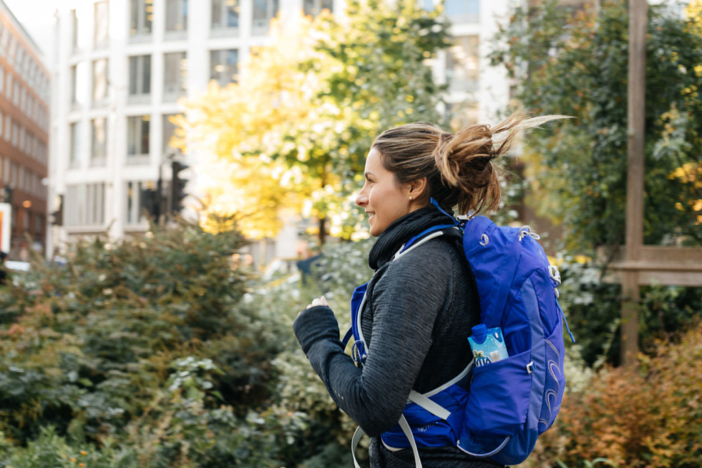 Stay organized. Doucette leaves shoes at work and carries her post-shower clothes in a Patagonia Black Hole packing cube to keep them tidy in transit.