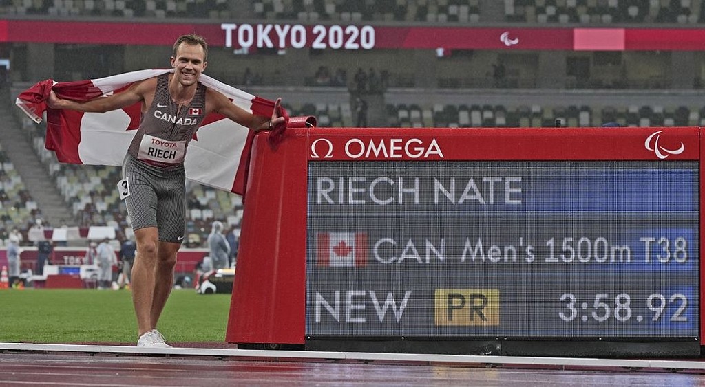 Canada’s Nate Riech captured gold in the men’s 1,500m, running 3:58.92 to set the T38 Paralympic record, in his debut at the Games.