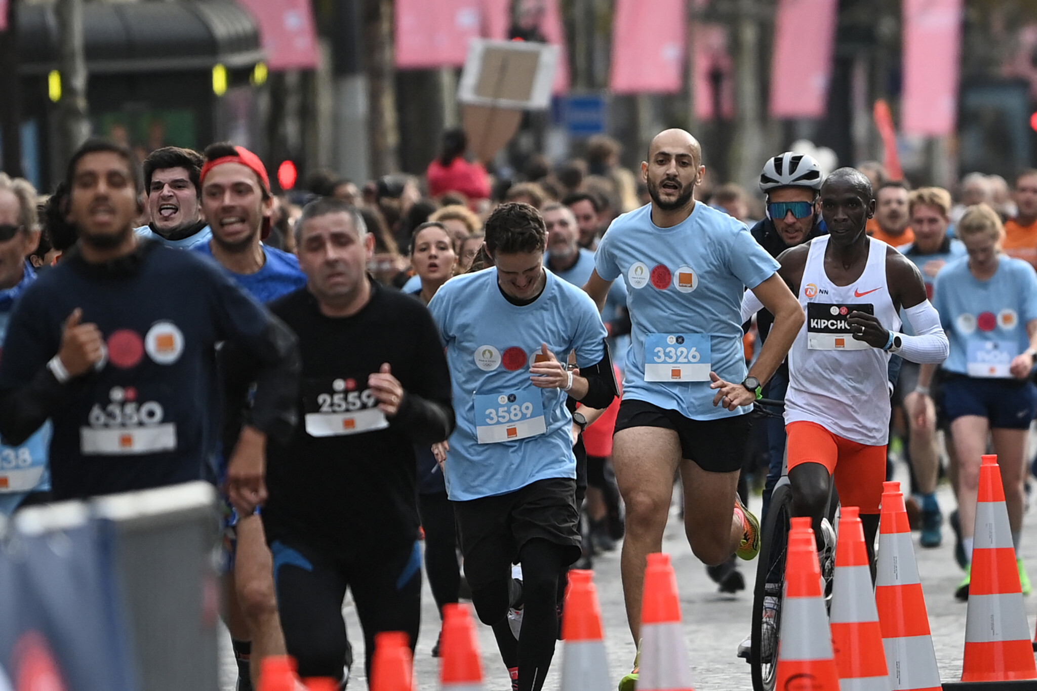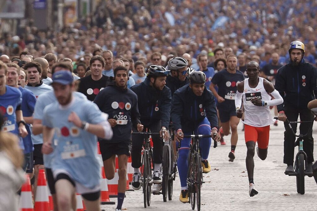 Participants set off before Kipchoge in different groups depending on ability today, racing on a course across the Place de la Concorde and the Champs Elysées.