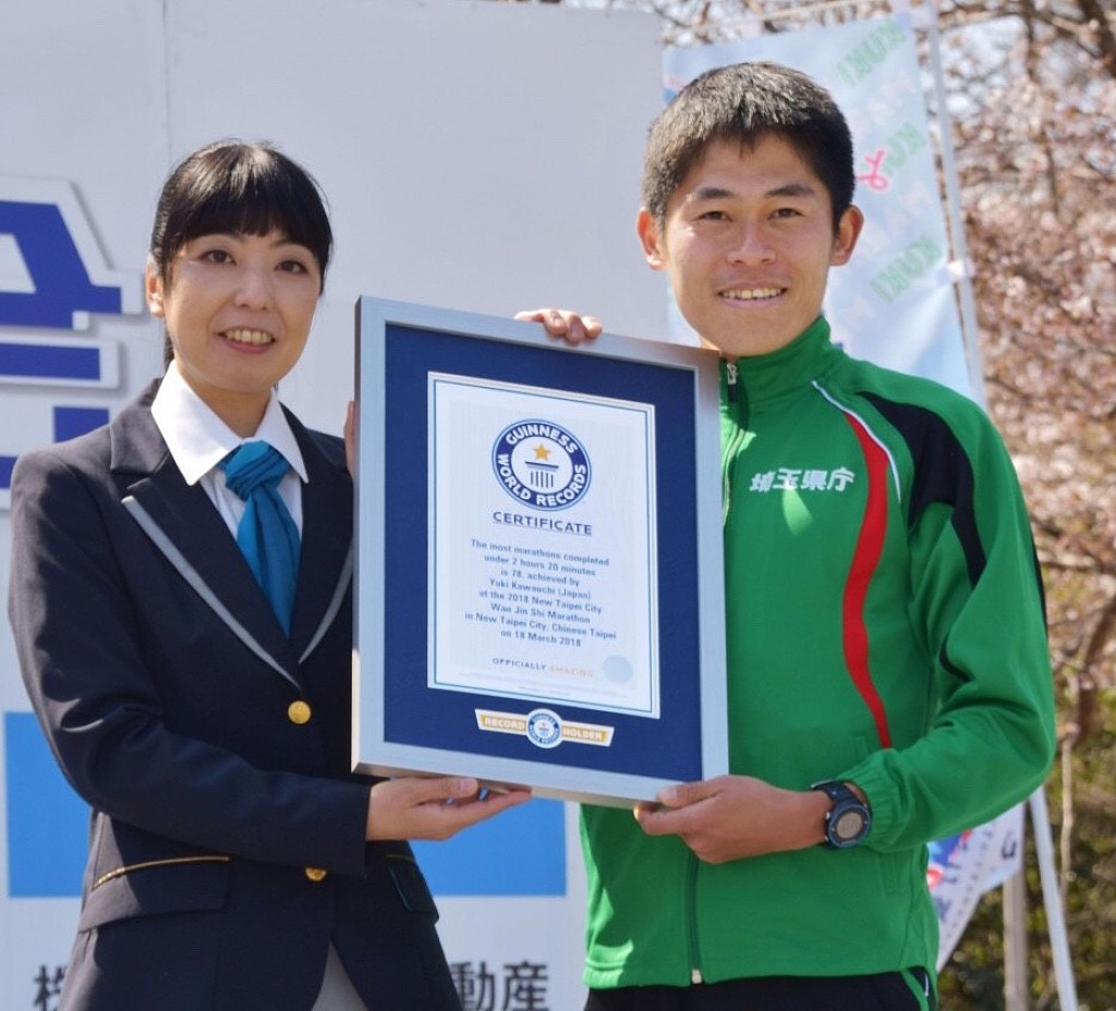 Yuki Kawauchi received a certificate from Guinness World Records in his hometown on Sunday recognizing him for completing the most number of marathons in under 2 hours and 20 minutes.
