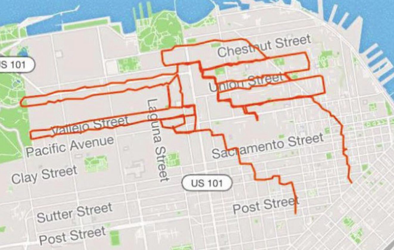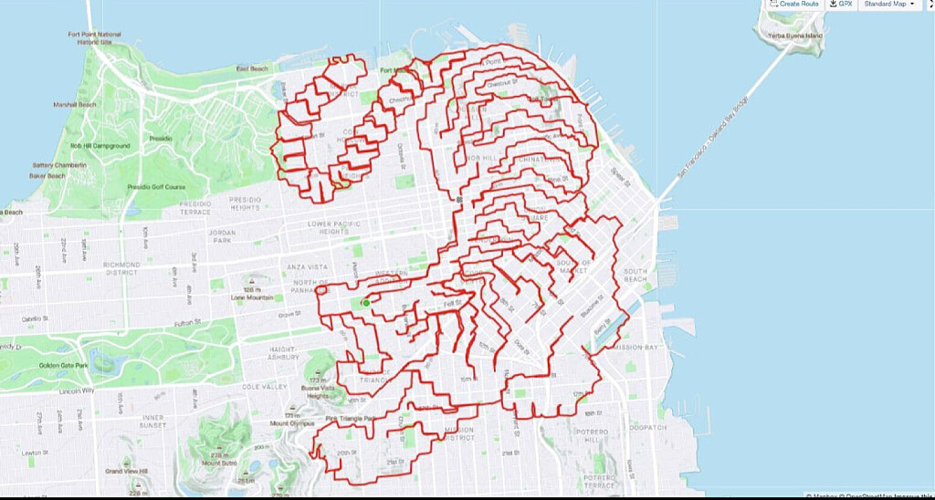 In a 2019 interview with SFGate, Maughan described the planning that goes into each piece. He prints out a paper map and sketches his route. He usually goes through several different iterations of the map before he sets off on a run. While he’s on his run, he must be very careful to follow the route – if he makes a wrong turn it could ruin the whole piece.