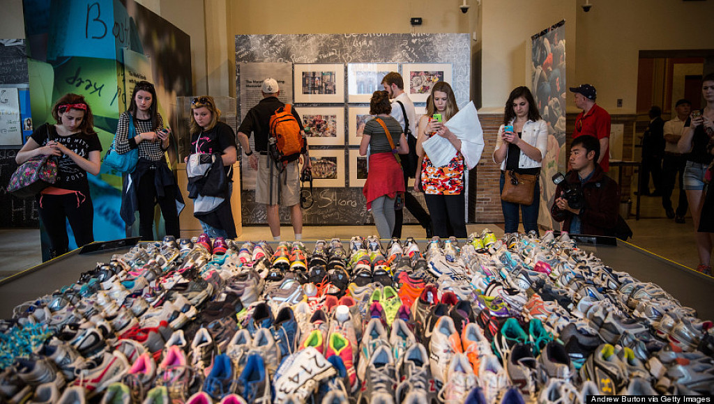 A Massachusetts museum will commemorate the fifth anniversary of the Boston Marathon bombing by displaying hundreds of running shoes left at the finish line. The memorial will be a part of an exhibit at the Attleboro Arts Museum entitled 'A Long-Distance Relationship: The 26.2 Mile Journey'. The exhibit will feature the 200 sneakers left at the marathon finish line by mourners in memory of three lives lost and more than 260 injured in the April 15, 2013 attack. The museum memorial will also include paintings inspired by the race, sculptures such as a giant winged foot, and other works by over 20 artists. Three running chairs used by father and son competitors Dick and Rick Hoyt will also be on display to raise awareness about people living with disabilities. The exhibit memorial runs from April 10 through May 5. April 16 will mark the 122nd year of the race - the oldest continuously run marathon in the US.