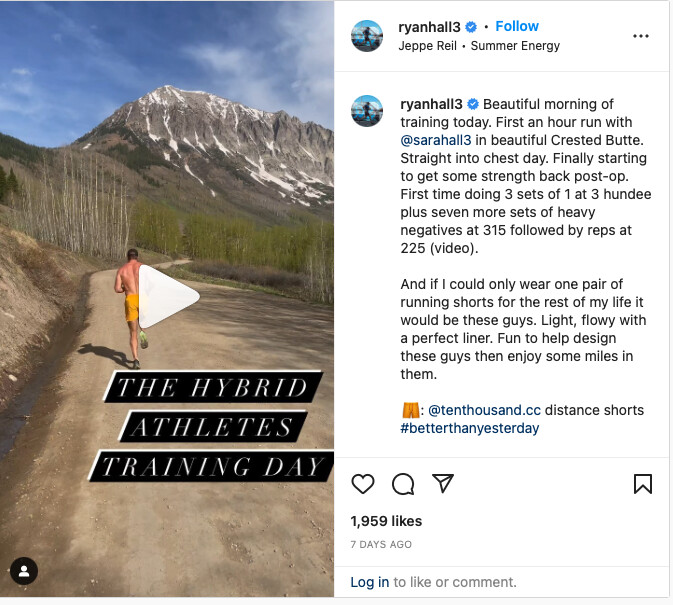"First an hour run with @sarahall3 in beautiful Crested Butte," he wrote in the caption. "Straight into chest day. Finally starting to get some strength back post-op. First time doing 3 sets of 1 at 3 hundee plus seven more sets of heavy negatives at 315 followed by reps at 225."