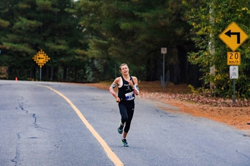 (First photo) Branna MacDougall of Kingston, Ont., approaches the finish line at the Muskoka Half-Marathon in 2020.