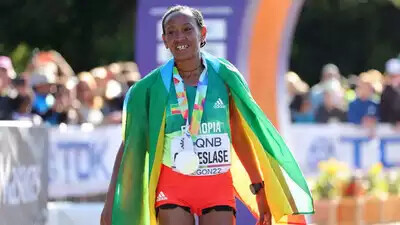 With a strong downhill surge in the 41st kilometer, Gotytom Gebreslase of Ethiopia won the 2022 world marathon title in 2:18:11. The time set a new championship record; the previous mark of 2:20:57 was held by Paula Radcliffe.