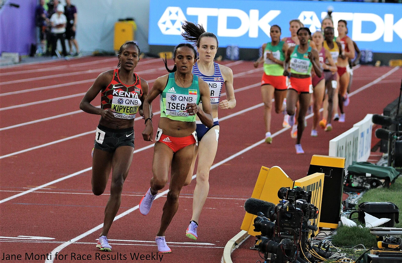 World indoor champion Gudaf Tsegay of Ethiopia was with her nearly every step until Kipyegon pulled away with about 300 meters to go. Tsegay took the silver in 3:54.52, upgrading from the bronze she won in 2019. She was also just a bit slower than she was at the Pre Classic, where she ran 3:54.21.